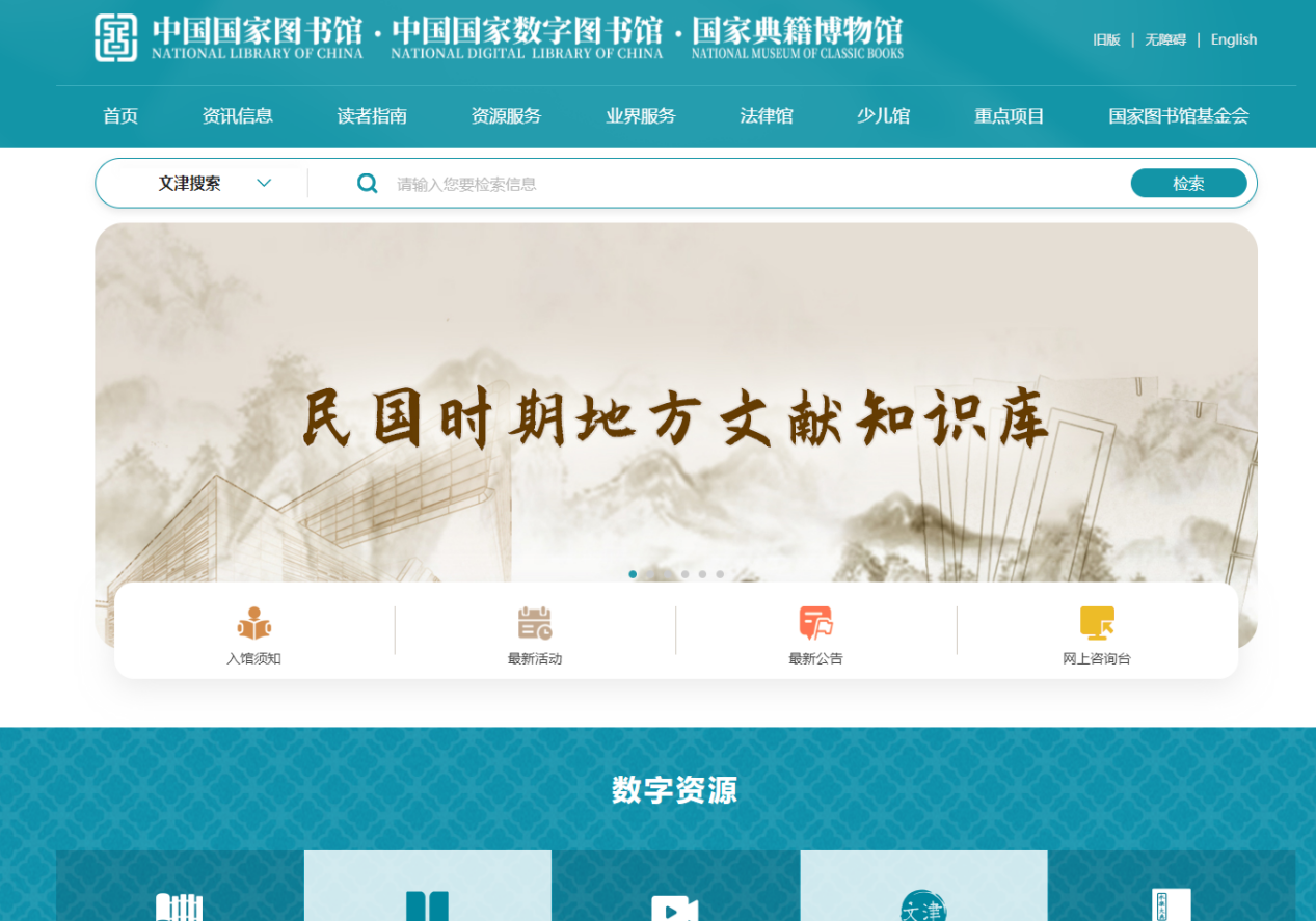 中国国家图书馆是国家总书库,国家书目中心,国家古籍保护中心,国家典籍博物馆。大量在线资源、子数据库、可以在线阅读海量电子书,内容涵盖图书、古籍、论文、期刊、音视频、少儿资源等。