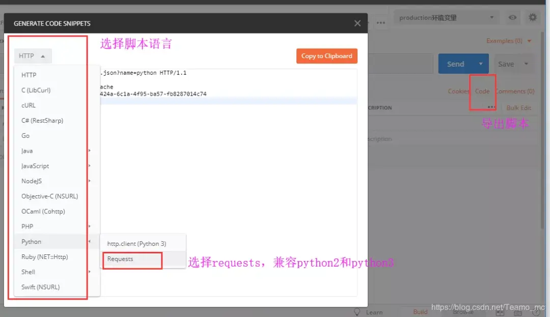 Postman的脚本可以导出多种语言的脚本,方便二次维护开发。