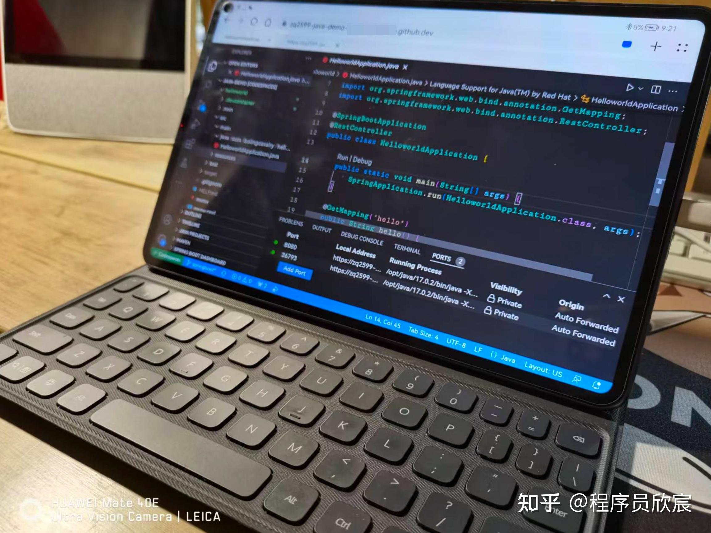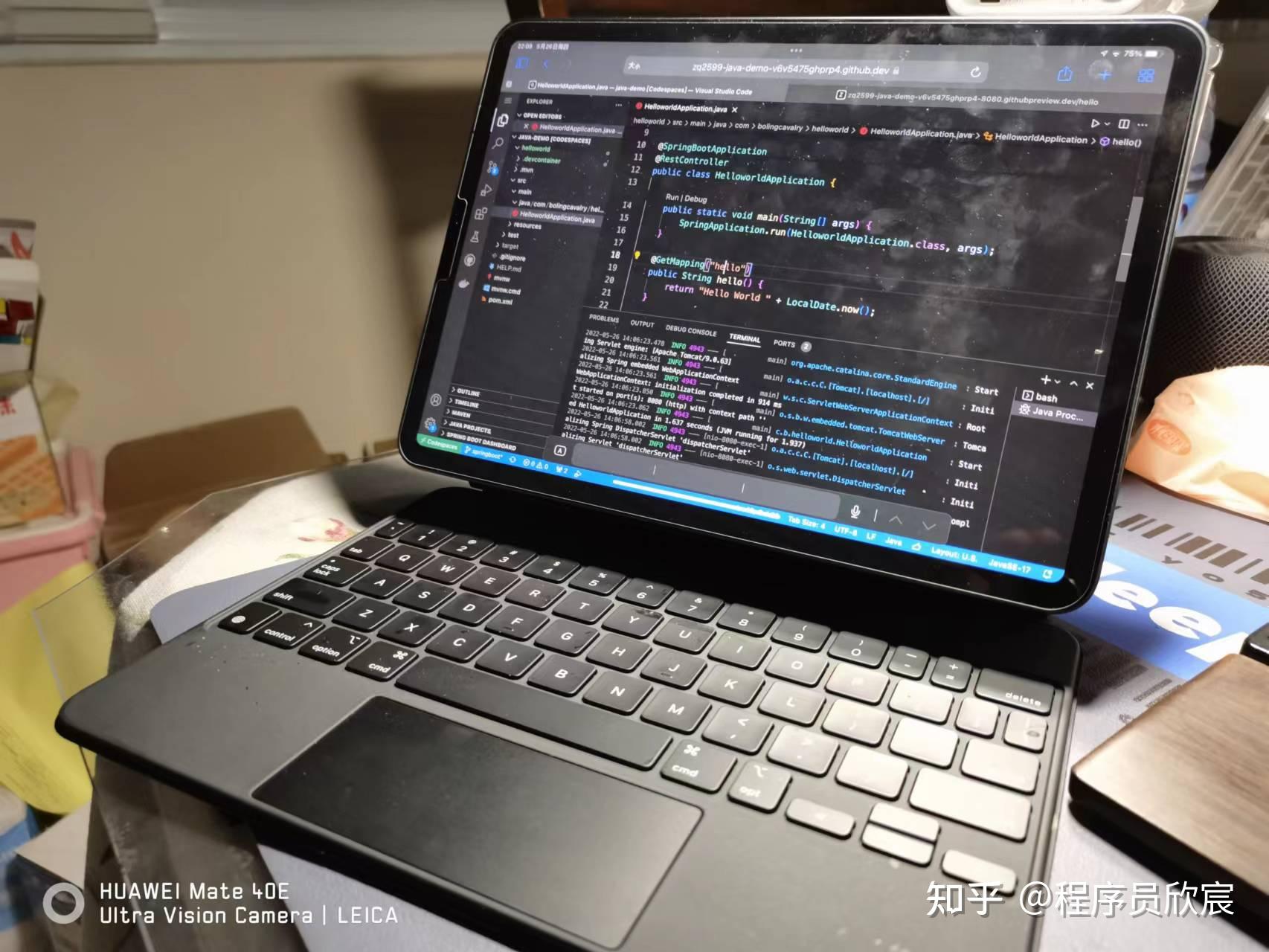可以用平板电脑在浏览器上写代码、运行代码,下图是在华为的MatePad Pro平板上编写SpringBoot应用的样子,看日志已经启动成功了