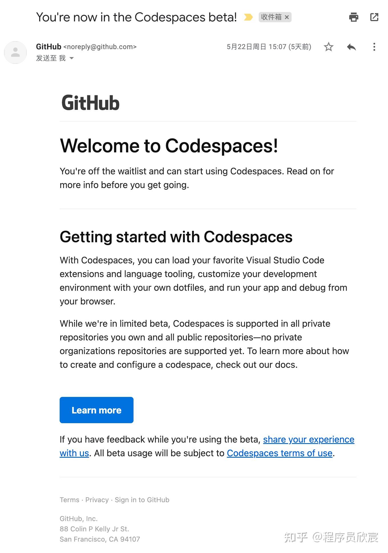 时间就这样过去了,欣宸依然是每天吃饭睡觉工作写博客的枯燥生活,直到几天前收到下面这封邮件,说我可以使用Codespaces的beta版本了