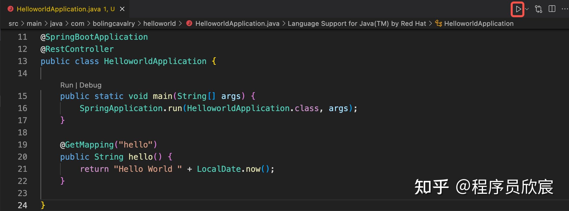- 打开应用入口类HelloworldApplication.java,增加几行代码用于验证,我这里是用RestController增加了一个web路径hello,如下图所示,编码完成后点击右上角的三角按钮启动应用