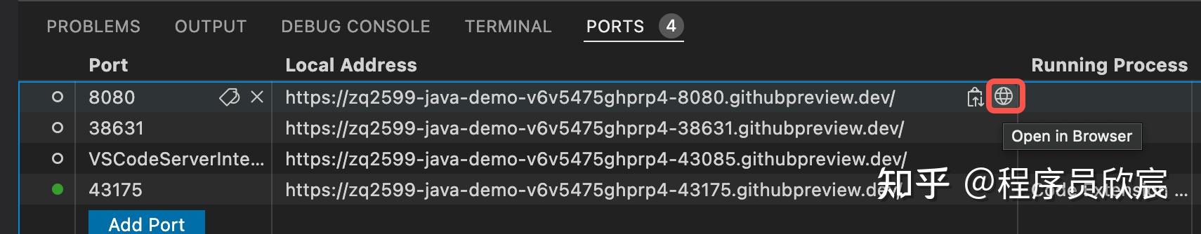 - 在出现的提示框中输入8080再回车即可,此刻列表中会出现新的端口转发配置,点击下图红框位置,就会在浏览器打开转发地址