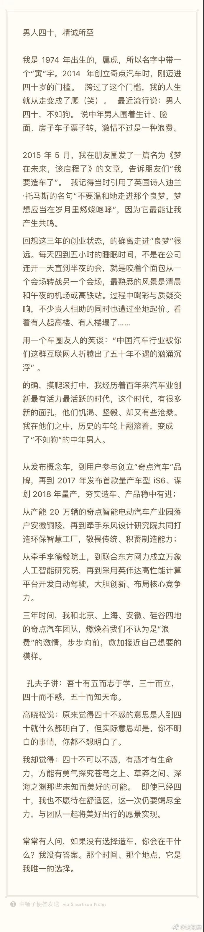 他当时在文中列举了几点成果:1、创立奇点,首款车型iS6谋划2018年量产;2、产能20万辆的奇点落户安徽铜陵,牵手东风设计院打造环保智慧工厂;3、牵手李德毅院士,联合东方网力成立万象人工智能研究院,采用英伟达高性能计算平台开发自动驾驶。从其表述看,离梦想不是远了,而是更近了才对。