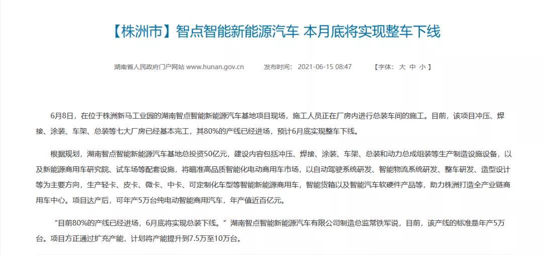 2021年6月15日,根据湖南省人民政府门户网站一则消息,智点汽车新能源汽车基地项目基本已经完工,其80%的生产线已经进场,预计6月底实现整车下线。