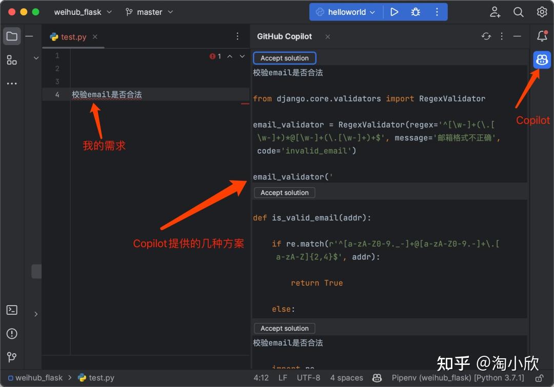 登录成功后就可以直接在编辑器里面使用。比如写一个邮箱校验函数,检查邮箱格式是否合法,直接点击右侧的Copilot机器人,就会弹出几个备选方案,双击 Accept solution 就可以把代码写入到文件中。