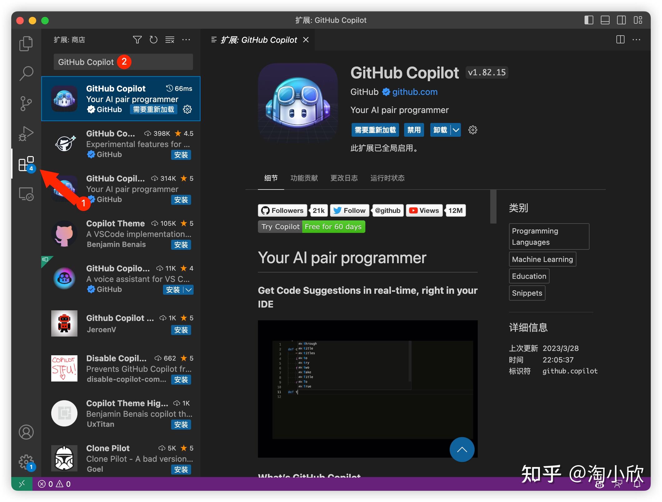 首先需要在 VS Code 编辑器中安装相应的插件。在 VS Code 中,点击左侧的“扩展”选项卡,搜索“GitHub Copilot”,并安装该插件,选择第一个即可