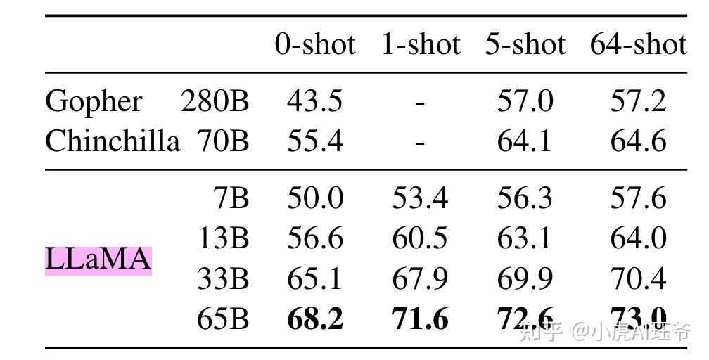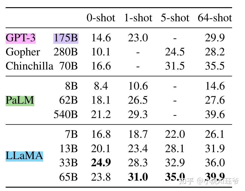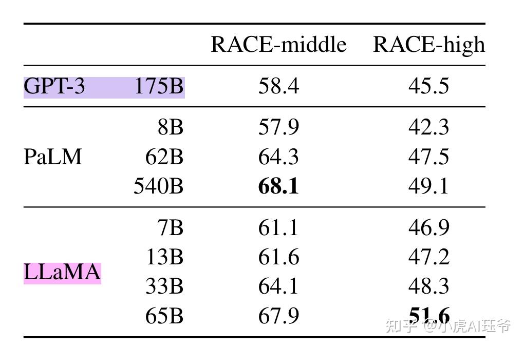 根据RACE阅读理解基准评估模型(Lai et al.,2017)。这个数据集是从为中国中学生和高中生设计的英语阅读理解考试中收集的。遵循Brown等人(2020)的评估设置,并在表6中报告结果。在这些基准测试中, LLaMA-65B与PaLM-540B具有竞争力 ,并且 LLaMA-13B的性能优于GPT-3几个百分点 。