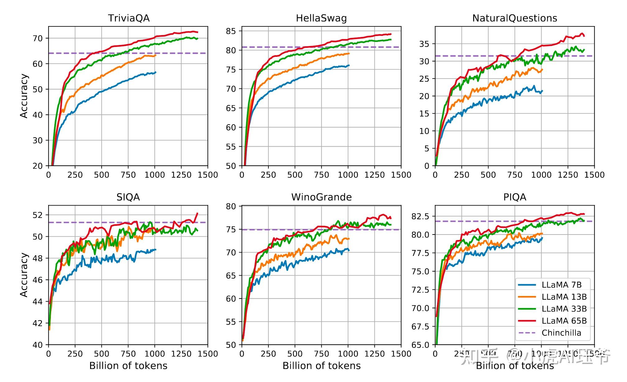在训练过程中,论文跟踪了模型在一些问答和常识基准上的性能,并在图2中进行了报告。在大多数基准测试中,性能稳步提高,并与模型的训练困惑相关(见图1)。SIQA和WinoGrande是例外。最值得注意的是,在SIQA上,观察到性能有很多差异,这可能表明该基准不可靠。在WinoGrande上,表现与训练困惑度并不相关:LLaMA-33B和LLaMA-65B在训练中表现相似。