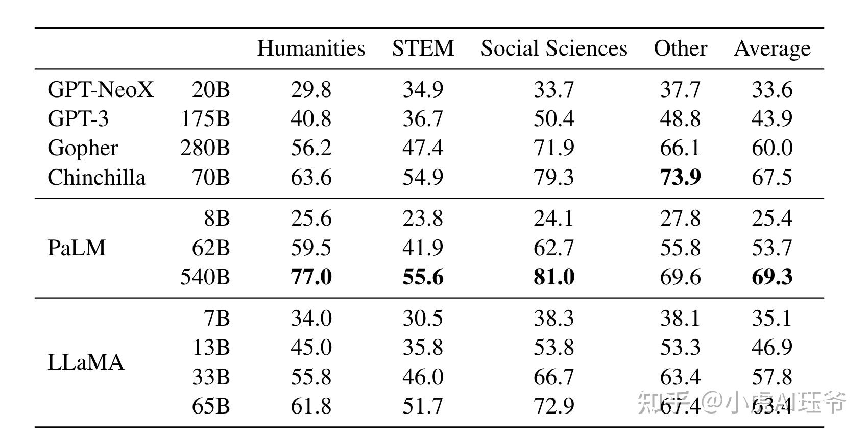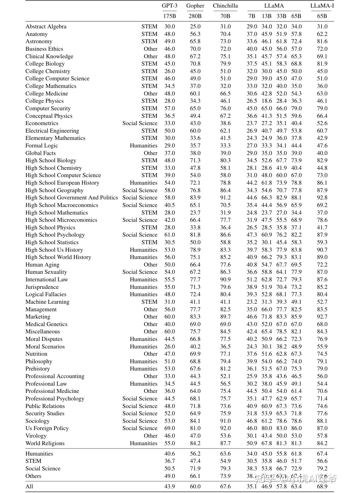 Hendrycks等人引入的大规模多任务语言理解基准(MMLU)。(2020)由涵盖人文学科、STEM和社会科学等各个知识领域的多项选择题组成。论文使用基准提供的示例,在5-shot设置中评估模型,并在表9中报告结果。在这个基准上,观察到LLaMA-65B在大多数领域中平均落后于Chinchilla70B和PaLM-540B几个百分点。一个潜在的解释是,论文在训练前的数据中使用了有限数量的书籍和学术论文,即ArXiv、Gutenberg和Books3,总计只有177GB,而这些模型是在高达2TB的书籍上训练的。Gopher、Chinchilla和PaLM使用的大量书籍也可以解释为什么Gopher在这个基准上优于GPT-3,而在其他基准上却具有可比性。
