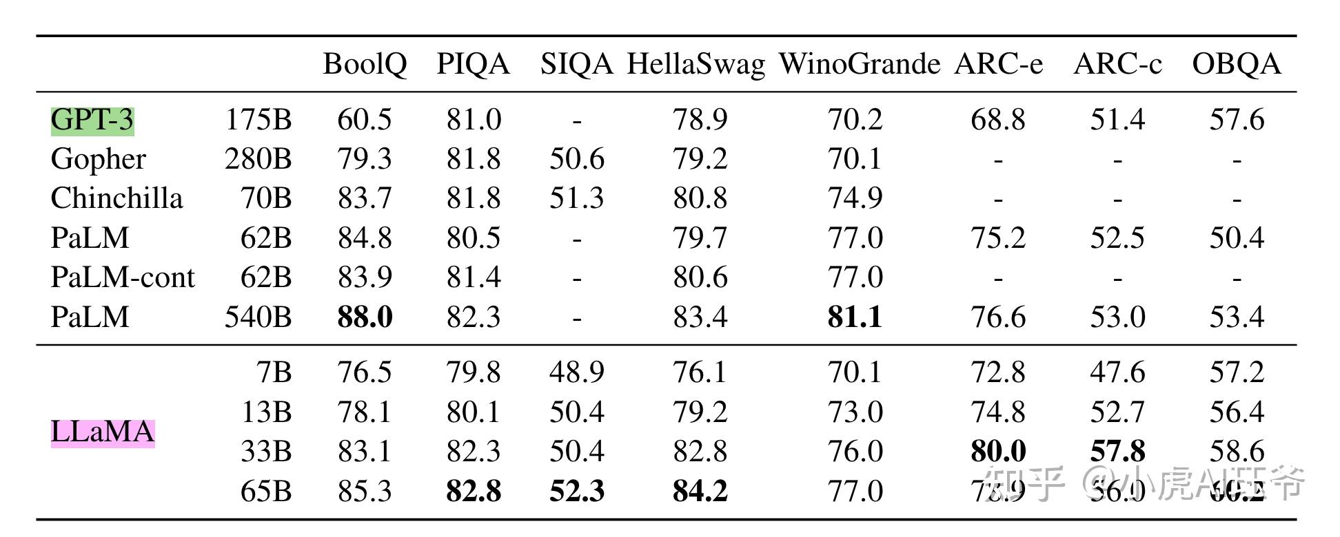 在表3中,将不同规模的现有模型和相应论文的报告编号进行了比较。首先,LLaMA-65B在除BoolQ之外的所有报告基准上都优于Chinchilla-70B。同样,除了在BoolQ和WinoGrande上,该模型在任何地方都超过了PaLM540B。 LLaMA-13B模型虽然小了10倍,但在大多数基准测试中也优于GPT-3 。