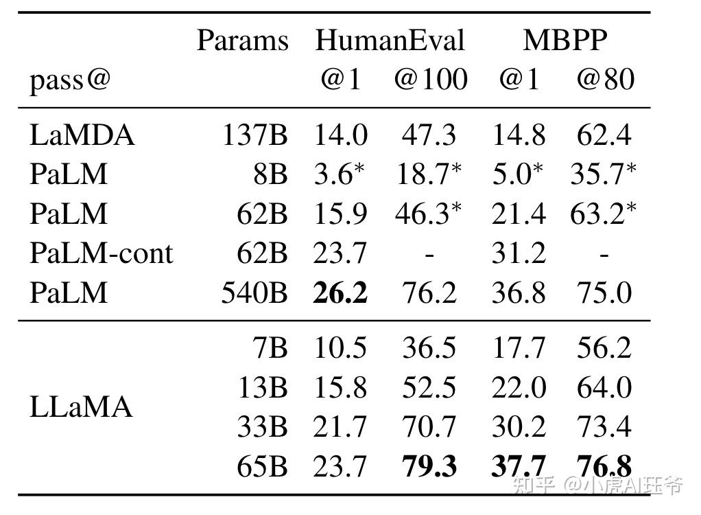 论文评估了模型在两个基准上根据自然语言描述编写代码的能力:HumanEval(Chen等人,2021)和MBPP(Austin等人,2021)。对于这两项任务,模型都会收到用几句话描述的程序,以及一些输入输出示例。在HumanEval中,它还接收一个函数签名,并且提示被格式化为自然代码,并在文档字符串中包含文本描述和测试。该模型需要生成一个符合描述并满足测试用例的Python程序。在表8中,比较了模型与未在代码上进行微调的现有语言模型的pass@1分数,即PaLM和LaMDA(Thoppilan et al.,2022)。PaLM和LLaMA是在包含相似数量代码tokens的数据集上进行训练的。