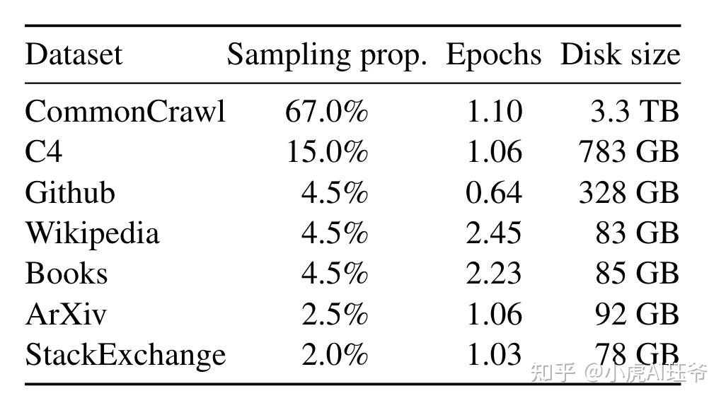 训练数据集是表1中报告的几个来源的混合,涵盖了一组不同的领域。在大多数情况下,论文重用已被用来训练其他LLM的数据源,但限制只能使用公开可用且与开源兼容的数据。这导致了以下数据及其在训练集中所代表的百分比的混合: