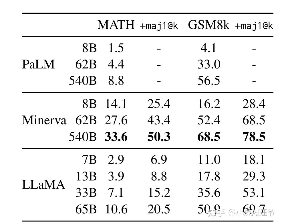 根据两个数学推理基准评估模型:MATH(Hendrycks等人,2021)和GSM8k(Cobbe等人,2021)。MATH是一个用LaTeX编写的12K中学和高中数学问题的数据集。GSM8k是一组中学数学问题。在表7中,与PaLM和Minerva进行了比较(Lewkowycz等人,2022)。Minerva是一系列对从ArXiv和Math网页中提取的38.5B tokens进行微调的PaLM模型,而PaLM和LLaMA都没有对数学数据进行微调。PaLM和Minerva的数字取自Lewkowycz等人(2022),比较有和没有maj1@k。maj1@k表示为每个问题生成k个样本并进行多数投票的评估(Wang et al.,2022)。在GSM8k上,观察到LLaMA65B的性能优于Minerva-62B,尽管它尚未在数学数据上进行微调。