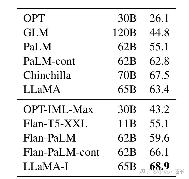 在本节中,展示了对指令数据的短暂微调可以快速改进MMLU。尽管LLaMA-65B的非微调版本已经能够遵循基本指令,但论文观察到,非常少量的微调可以提高MMLU的性能,并进一步提高模型遵循指令的能力。由于这不是本文的重点,论文只进行了一个实验,遵循与Chung等人相同的协议。(2022)来训练指令模型LLaMA-I。