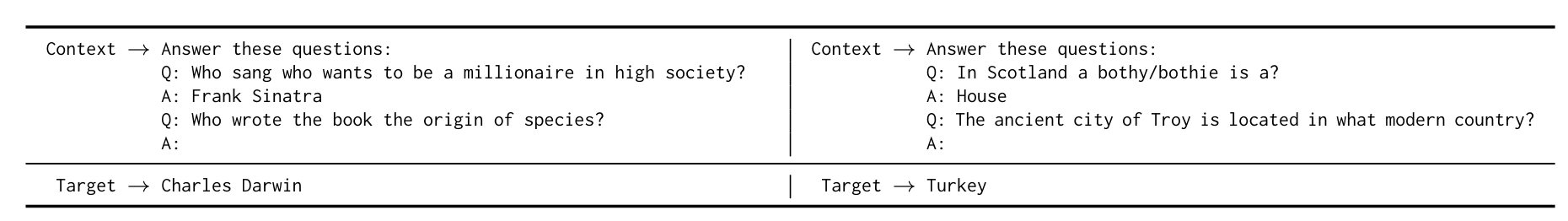 Few-shot。 提供了一些任务示例(介于1和64之间)和一个测试示例。该模型将该文本作为输入,并生成答案或对不同的选项进行排序。