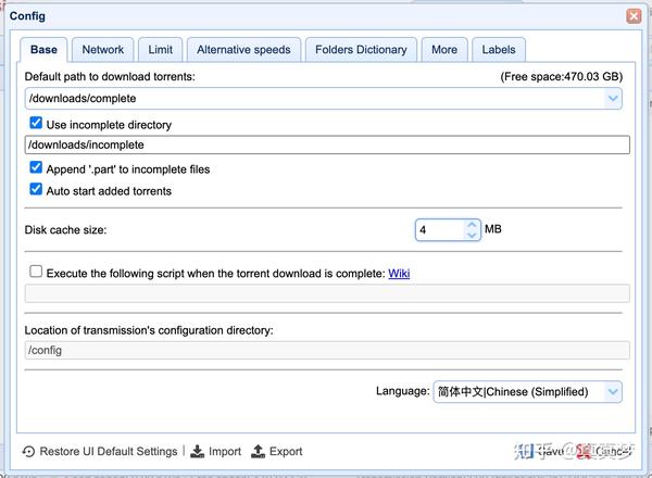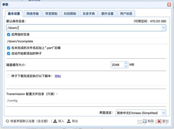 再次进入设置界面,把【默认保存目录】修改为刚才安装docker第8步里的【装载路径】,我当时输入的是/down,这里就改为/down/,把【启用临时目录】也改成装载路径/incomplete。磁盘缓存大小我设置成2048,也就是2G,可以降低机械硬盘的写入频率,设置成1024也可以,不要过于太大,设置完成后点击【保存】:
