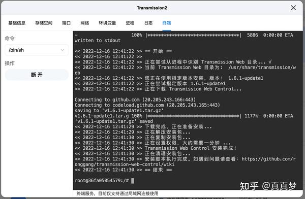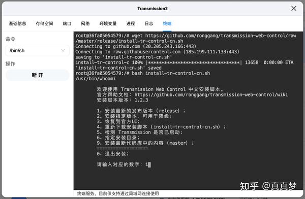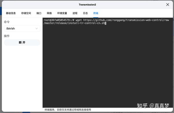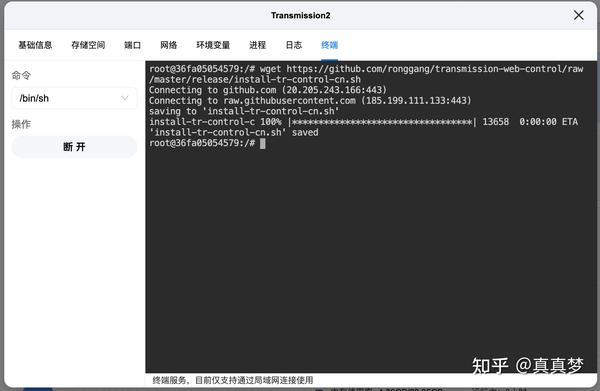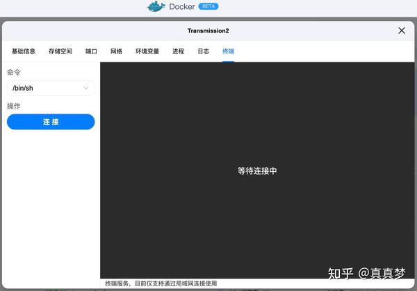 1.这里还需要安装汉化Web界面方便使用。回到Docker【容器管理】,点击Transmission下方的【详情】,点击【终端】,点击【连接】: