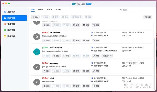说明一下,我这里选用的是Transmission作为PT下载工具,如图,连续不间断稳定运行已经2周时间了,CPU和内存使用率这里有点BUG,实际上是没有那么多的。本来一开始是用qBittorrent的,因为功能多一点嘛,后来发现Docker版qBittorrent并不稳定,经常会重启(在其他NAS上试过也是如此),就一直用Transmission了: