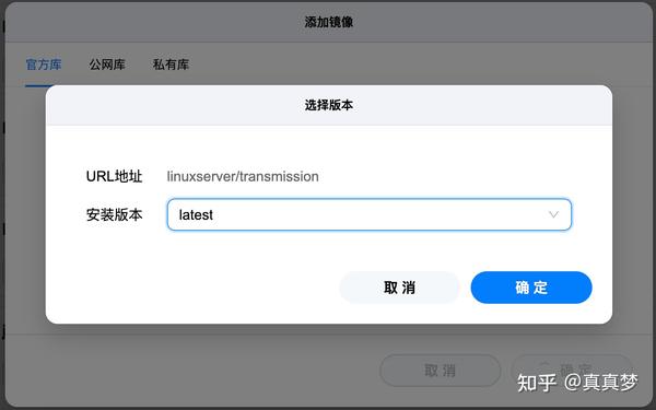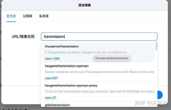 3.在输入框里输入【transmission】,点击选择【linuxserver/transmission】,再点击【确定】: