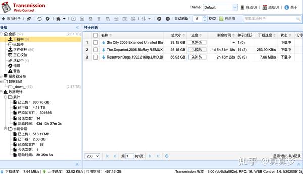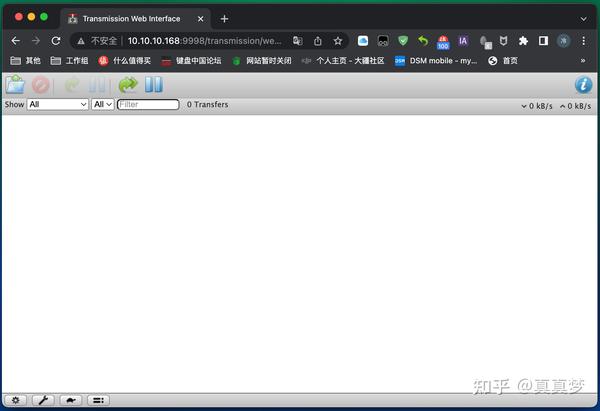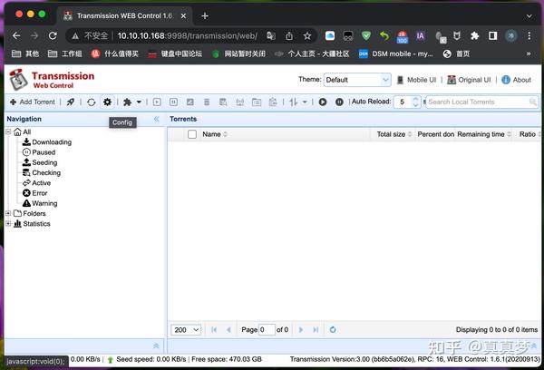建议把网址存入书签,下次可以直接从浏览器里访问Transmission。 默认的web界面极其简陋,功能也比较少: