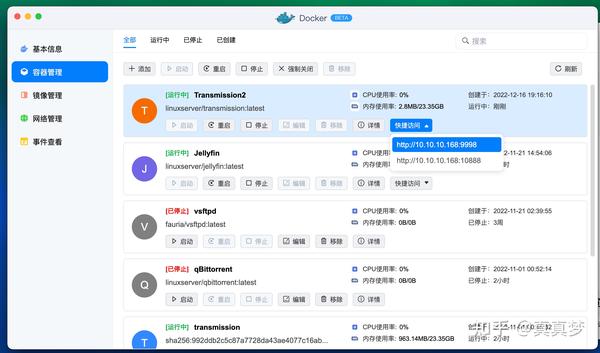 安装完成之后,进入Docker的【容器管理】,找到刚才安装的Transmission,点击【启动】,再点击【快捷访问】里的网址就可以访问Web管理界面了: