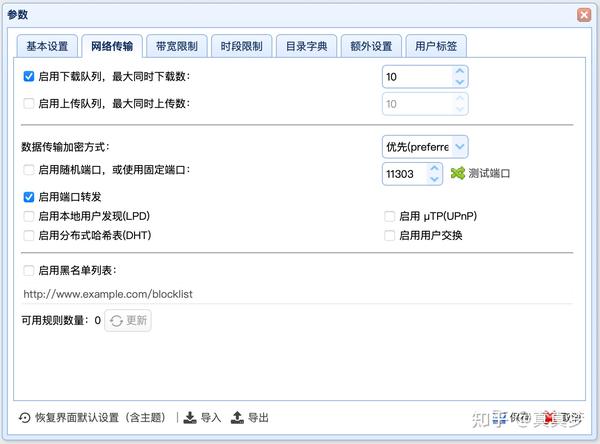 做纯PT下载的话,还要在【网络传输】里把【启用分布式哈希表DHT】、【启用用户交换】关掉,否则可能白白浪费上传量,甚至被封号: