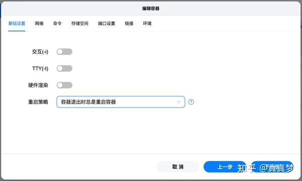 10.点击顶上的【基础设置】,在【重启策略】里选择【容器退出时总是重启容器】,设置之后每次开机才会自动运行Transmission,点击【下一步】: