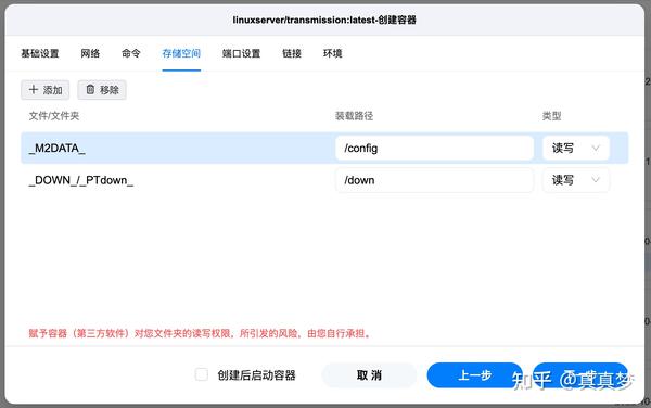 8.点击顶上的【存储空间】,点击【添加】,把刚才创建的下载文件夹转载上去,【文件/文件夹】处选择下载盘里的下载文件夹,【装载路径】填写【/down】,用同样方法顺便再把默认的/config改成固态硬盘(或者存储docker的盘里也行),类型改成【读写】,如图所示,配置好就像这样: