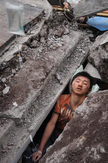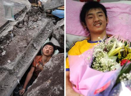 躺在病床上的廖波曾向记者讲述了他地震后死里逃生的经历——“12日下午地震发生时,我们正在上课,在一阵剧烈摇晃中,教学楼‘轰’地一声坍塌了,全班同学惊叫着掉了下去。过了不知多久,我才在一阵巨痛中睁开了眼睛,发现自己被埋在了乱石堆中。幸好,垮下来的天花板之间有一条缝隙,但是我的头部和左手被压住了,脚也卡在了凳子间。我腾出右手刨掉了头上的泥土,并大声呼叫老师,可没听见任何回音。“随后的几个小时,废墟下一些受伤的同学陆续停止了呻吟。到天黑时,我发现只剩下我和身边的四个同学还活着。我不断地提醒自己,一定要坚持下去。在度过了漫长的黑夜之后,13日凌晨6点钟左右,前来救援的解放军叔叔终于发现了我们。“由于我的脚上压了许多沉重的水泥板,救援进行得非常艰难。解放军叔叔轮流钻到我身边,小心翼翼地把旁边的砖块搬开,并一直鼓励着我,叫我要坚强。医生也赶来了,为我打起了吊针,几个同学用手托着输液瓶,先后轮换着为我输液。上午10点左右,解放军终于把我救了出来,并迅速送到了