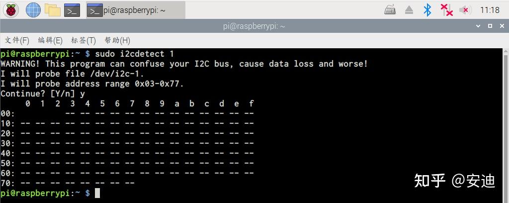 确认已成功安装后,可使用以下命令遍历这个总线,检测当前已挂在该总线上的I2C设备,并显示出被检测设备的I2C寄存器地址。如下图所示,如未挂有设备,显示为[--]。
