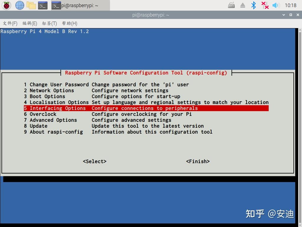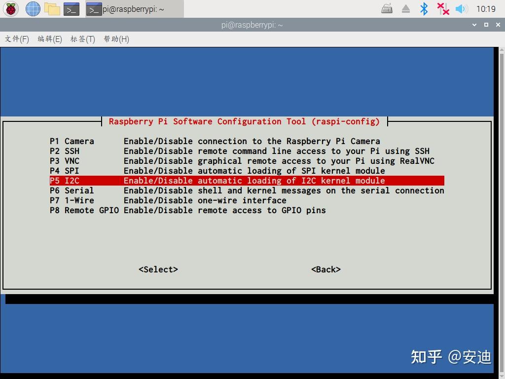 在raspi-config的图形配置界面中,通过上下键选择接口选项[5 Interface Options],在下一个界面中选择I2C选项[P5 I2C],启用后,选择[Finish]退出配置界面,如下图所示。