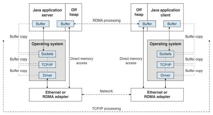 与TCP协议不同,RDMA协议是在高速交换结构之上定义的,如InfiniBand,它独立于操作系统内核。相反,网络处理被卸载到专用的RDMA网络接口适配器。RDMA协议允许一个主机上的Java应用程序直接访问不同主机上的Java应用程序的内存。此功能支持在Java应用程序之间直接传输数据。