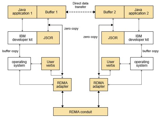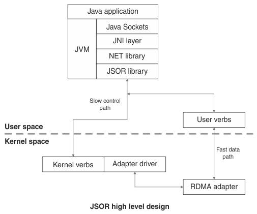 通过指定运行时配置文件来启用远程直接内存访问(RDMA), 这种方式与Sockets Direct Protocol(SDP)配置文件具有类似格式的。启用RDMA后,传统的TCP套接字会透明地切换到RDMA套接字。与传统以太网连接相比,此连接允许客户端和服务器端点通过InfiniBand交换结构以更高的数据传输速率进行通信。JSOR仍然使用Java Socket接口,使用JSOR,应用程序开发者不必更改现有的代码,因为它仍然使用相同的Java Socket套接字接口。JSOR是IBM公司开发的一种基于RDMA的高性能通信库,现在已经放入到IBM SDK, Java Technology Edition 8.0.0 作为IBM Java基础通信库。