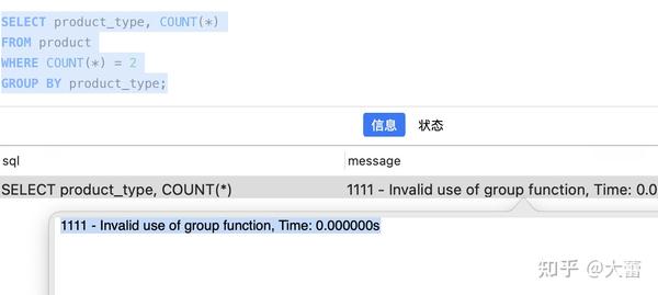 - 在WHERE中使用聚合函数会报错 ,原因是聚合函数的使用前提是结果集已经确定,而WHERE还处于确定结果集的过程中,所以相互矛盾会引发错误。 如果想指定条件,可以在SELECT,HAVING(下面马上会讲)以及ORDER BY子句中使用聚合函数。