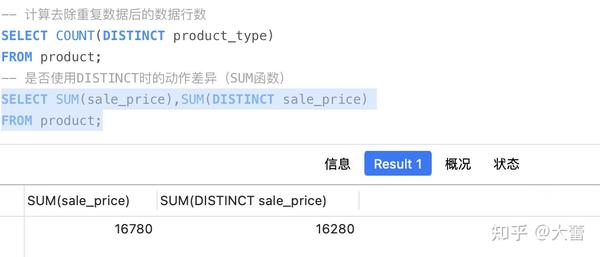 - 在聚合函数的参数中使用DISTINCT,可以删除重复数据。
