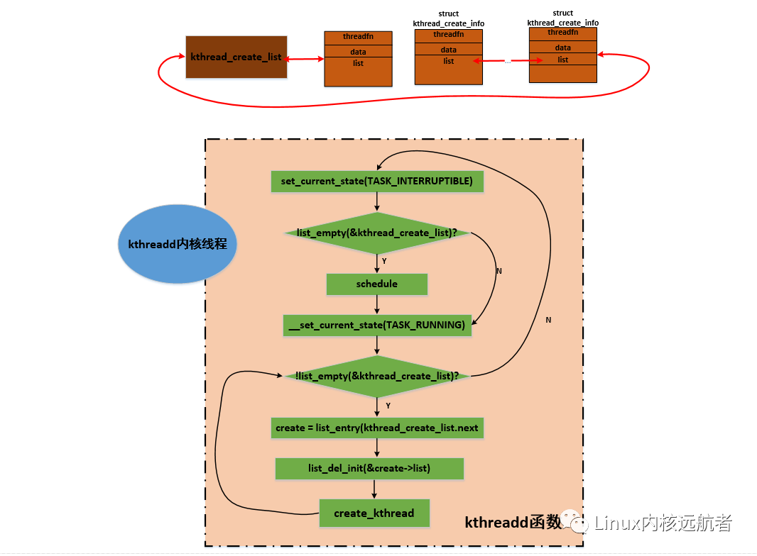 它首先将自己的状态设置为TASK_INTERRUPTIBLE,然后判断kthread_create_list链表是否为空,这个链表存放其他内核路径的创建内核线程的请求结构struct kthread_create_info:
