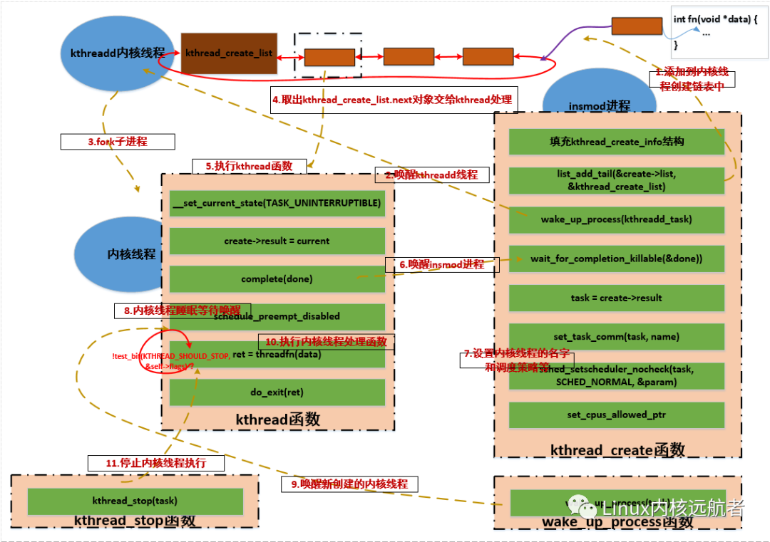 关于__kthread_create_on_node函数需要明白以下几点:1.__kthread_create_on_node函数处于一个进程上下文如insmod进程 2.__kthread_create_on_node函数需要与两个任务交互,一个是kthreadd,一个是kthreadd的创建的内核线程(执行函数为kthread)