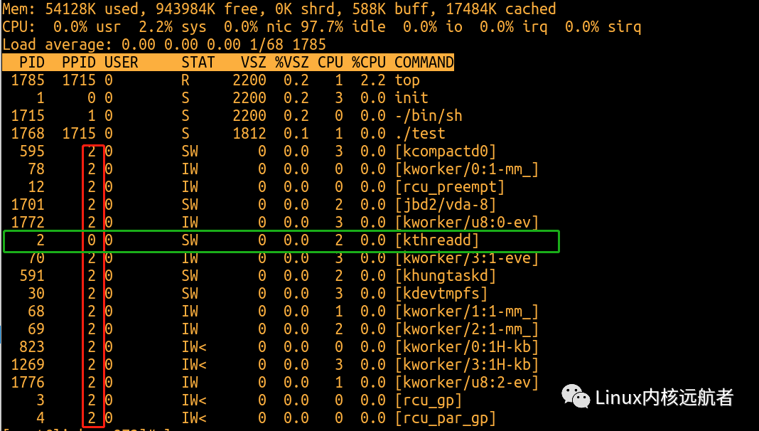 ,我们通过top命令可以观察到:红色方框都是父进程为2号进程的内核线程,绿色方框为kthreadd,他的父进程为0号进程。