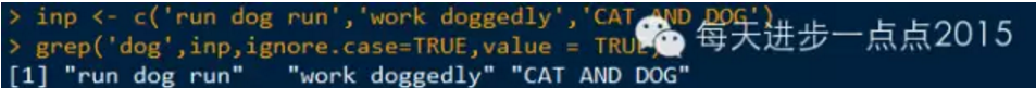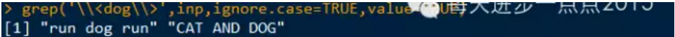 grep()函数接受一个正则表达式和一个字符串或字符串向量,并返回由正则表达式匹配的字符串元素的索引。 如果参数value=TRUE,则它将返回与正则表达式匹配的实际字符串而不是其索引号。