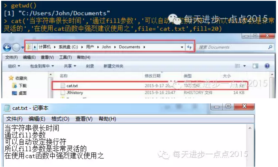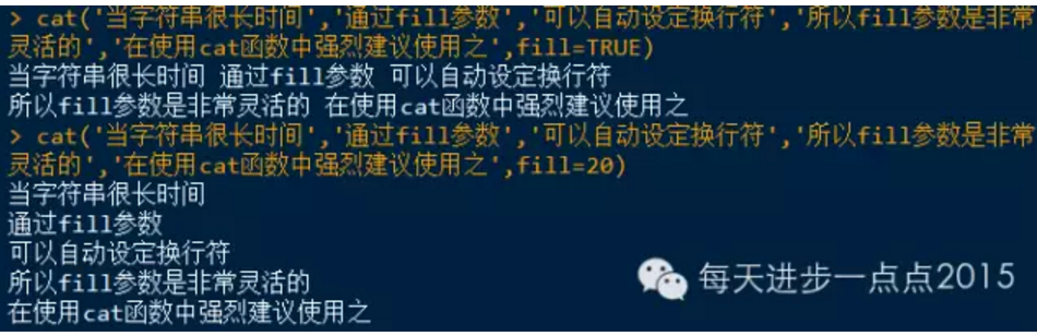 cat()函数的参数fill可用于输出字符串中自动插入换行符,如果fill设置为TRUE,则系统的width值将被用来确定行宽,