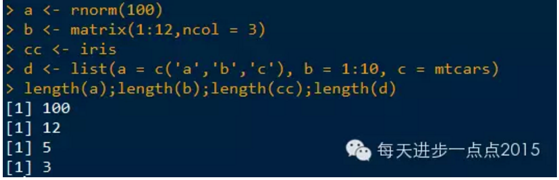length():返回向量元素的个数、矩阵元素的个数、数据框字段数量和列表元素的个数。