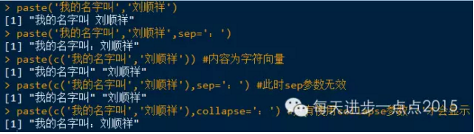 paste()函数可以无限量的连接字符串,当把一个字符向量传递给paste()函数时,通常使用collapse=参数,因为sep=参数对输入的向量不起作用
