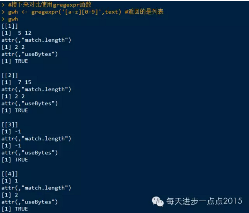 regexpr()和gregexpr()函数可用于准确指出和提取字符串中与正则表达式相匹配的部分,这两个函数的输出为一个向量和列表,由所发现的正则表达式的起始点组成;如果没有匹配发生,返回值为-1,此外,match.length属性与起始点向量结合, 提供字符匹配的准确信息。regexpr函数只提供其输入字符串中第一个匹配的有关信息,而gregexpr函数返回所有匹配的信息。