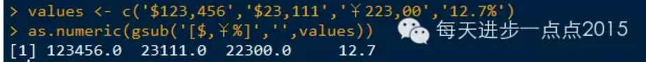 这两个函数的一个重要用途涉及到数值型数据中,这些数据从网页或财务报表中读入,并可能包含逗号或美元符号。