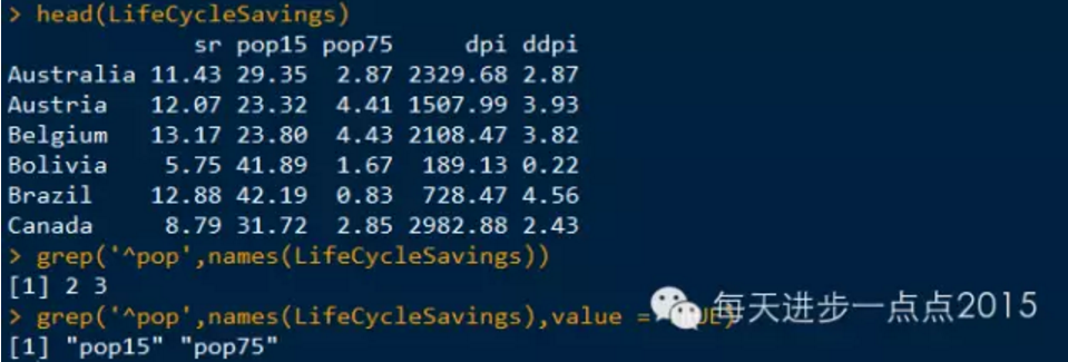 如在LifeCycleSavings数据框中,存在两个变量,都是以'pop'开头,我们可以使用grep函数找到这两个变量
