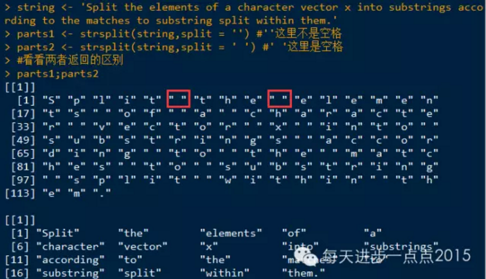 strsplit()函数还可以接受正则表达式来决定在哪里拆分字符串,例如,一个字符串中含有多个空格,当使用空格作为拆分符时,就可能返回多余的空字符串 。