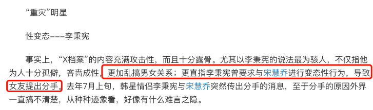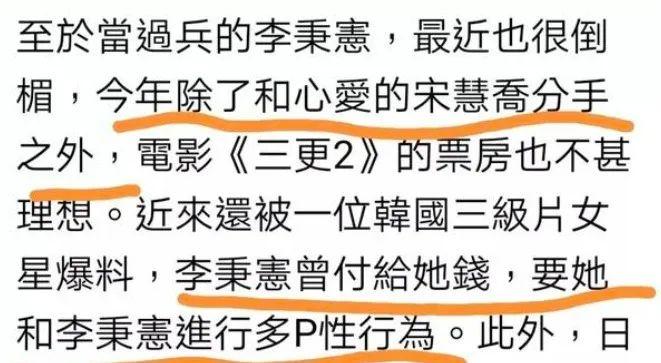 其中,以李秉宪性变态为最爆炸的新闻,尤其是他与宋慧乔分手的原因,原来是在性爱过程中玩得太大,以至于对方忍受不了终于说了再见。
