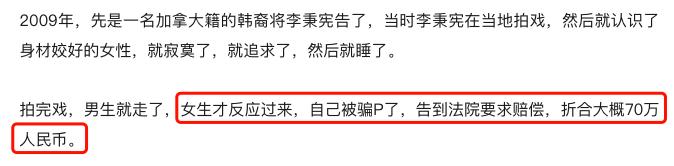 了解后才知道,这不过是李秉宪这拍戏过程中的不甘寂寞罢了,最终这件事以他赔偿了70万人民币而告终。