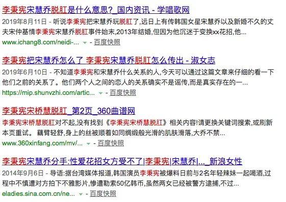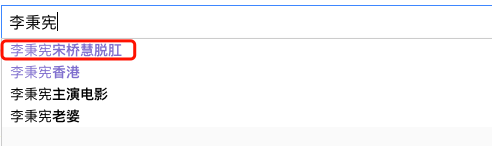 在百度,搜李秉宪会迅速跳出一个关联词: 李秉宪宋慧乔脱肛。