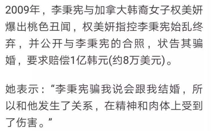 到了2009年,加拿大韩籍女演员权美妍把李秉宪给告了,因为对方明明说好要娶自己,然而上了床之后却翻脸不认人。